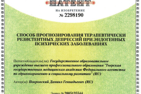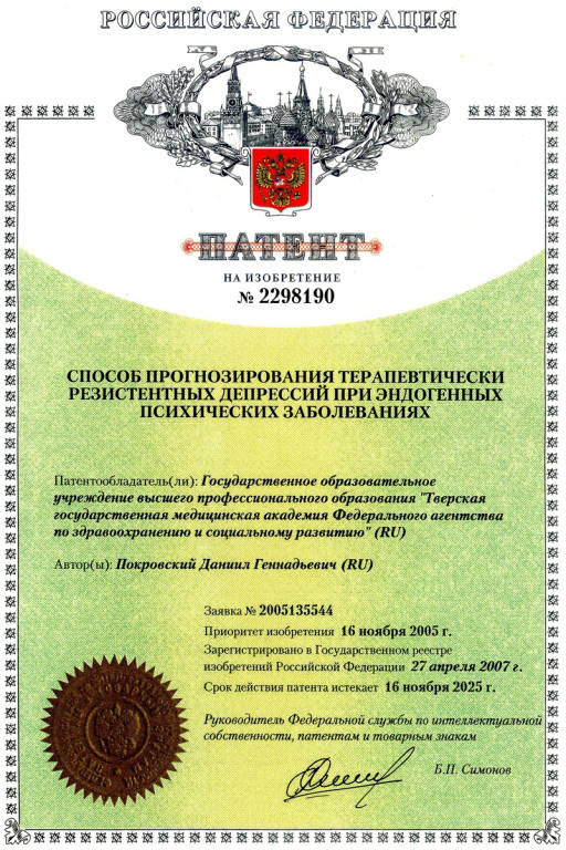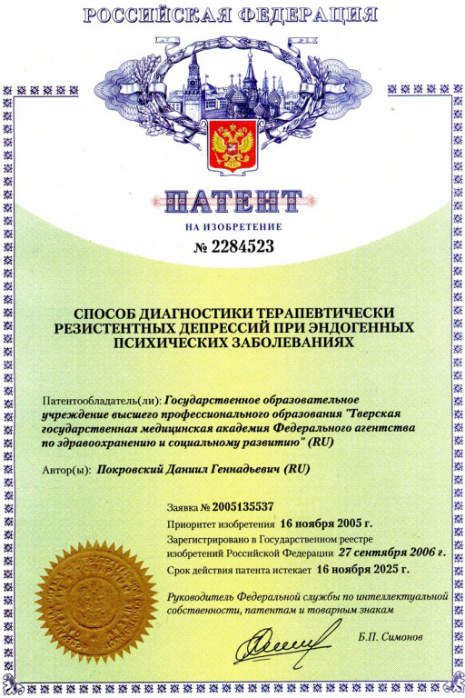 Имеет 9 патентов по диагностике и терапии психических расстройств.